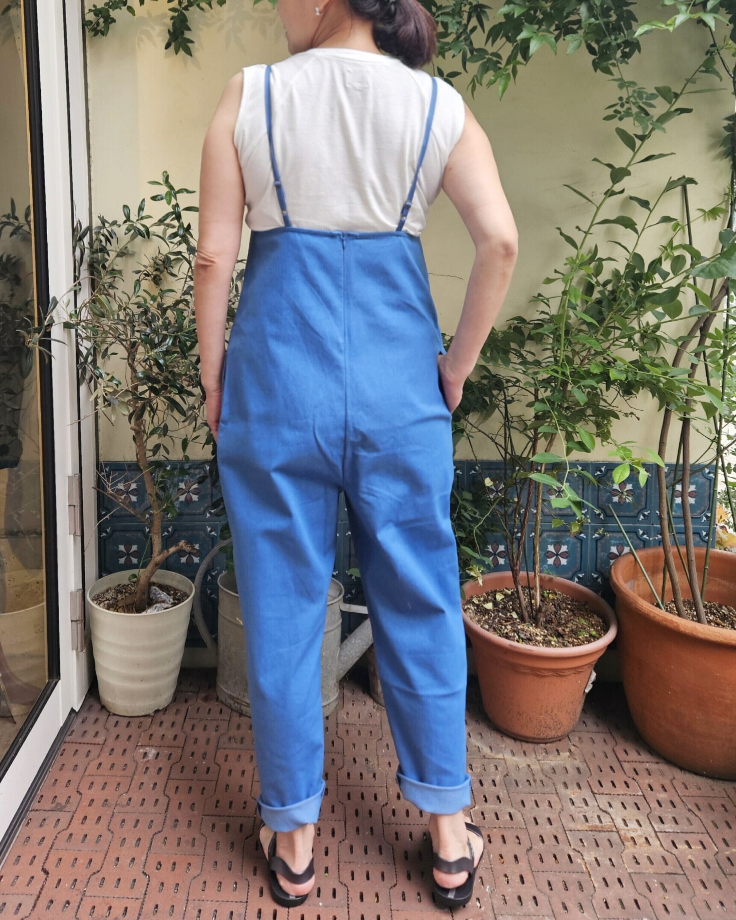 程よい厚さでストレッチがよく効いたデニムロンパースはストレスフリーな着心地