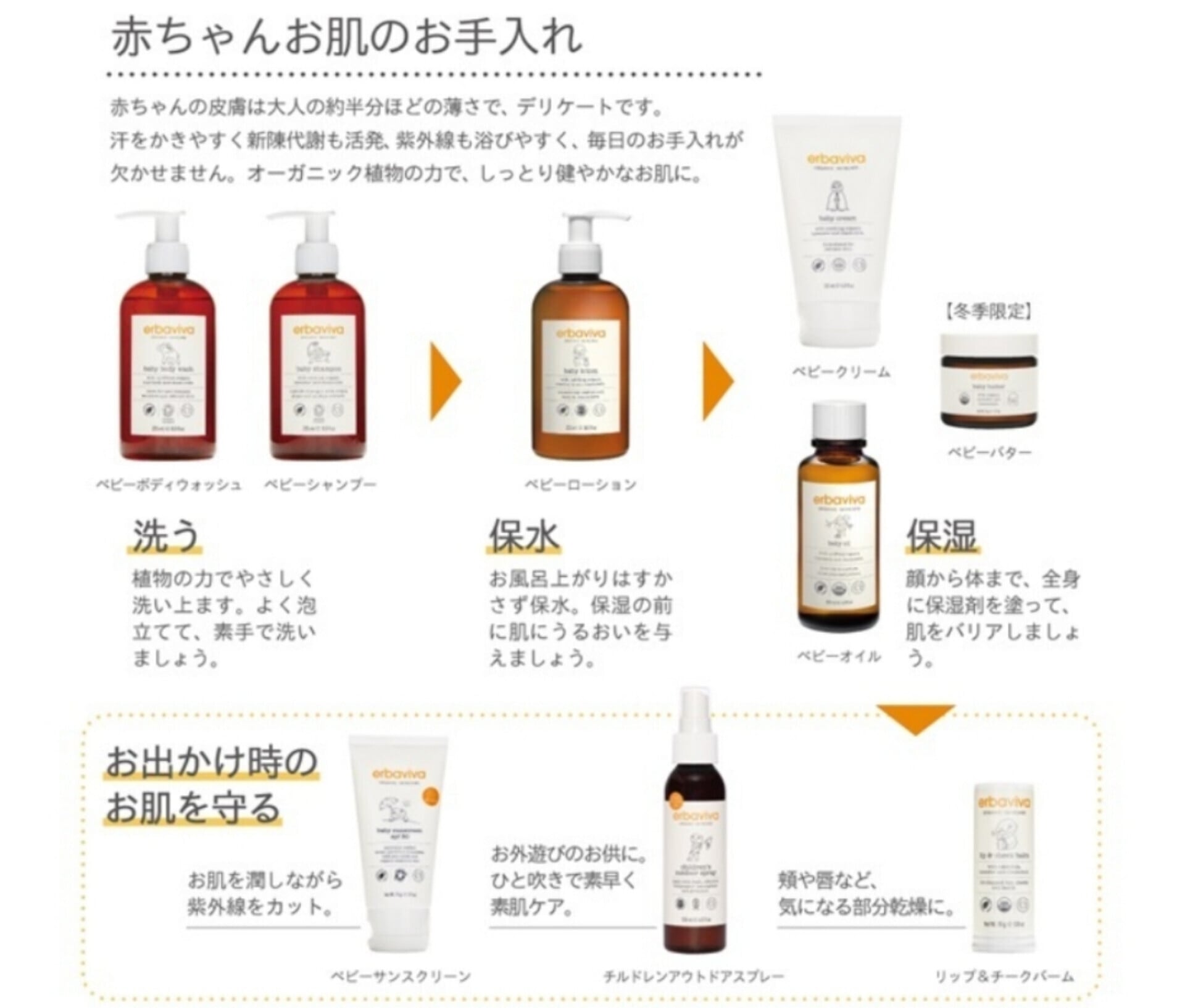 エルバビーバのベビースキンケアラインは新生児や赤ちゃんの肌へのなじみやすさや、デリケートな肌のためにとても注意深く作られています