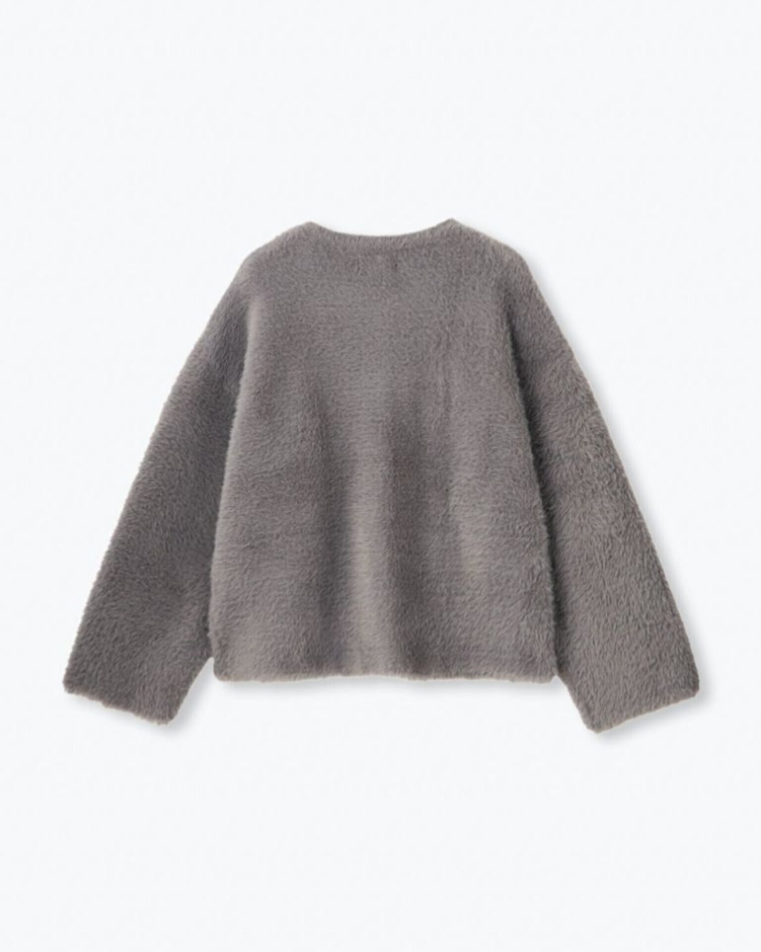 クルーネック、隠しスナップボタンですっきりとした見た目の羽織り