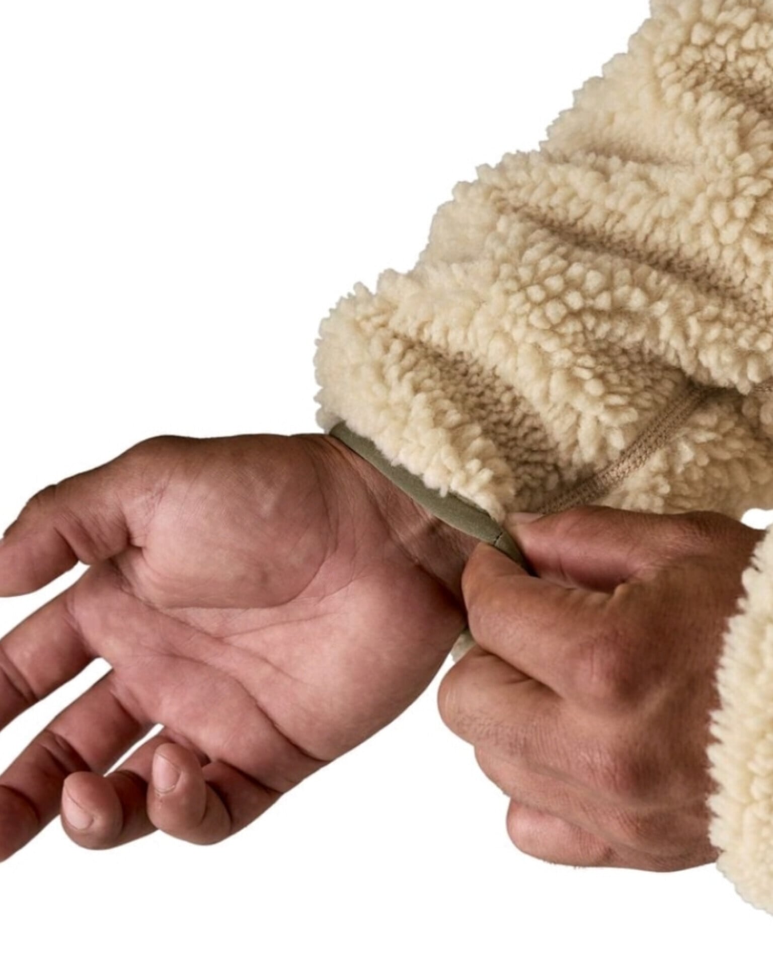 *プラスチック汚染の危機にさらされている沿岸部の共同体から供給された、オーシャンサイクルの認証済みのリプリーブ・リサイクル・ポリエステル100%の6ミリ厚パイル・フリースで作ったソフトで温かい防風性ジャケット