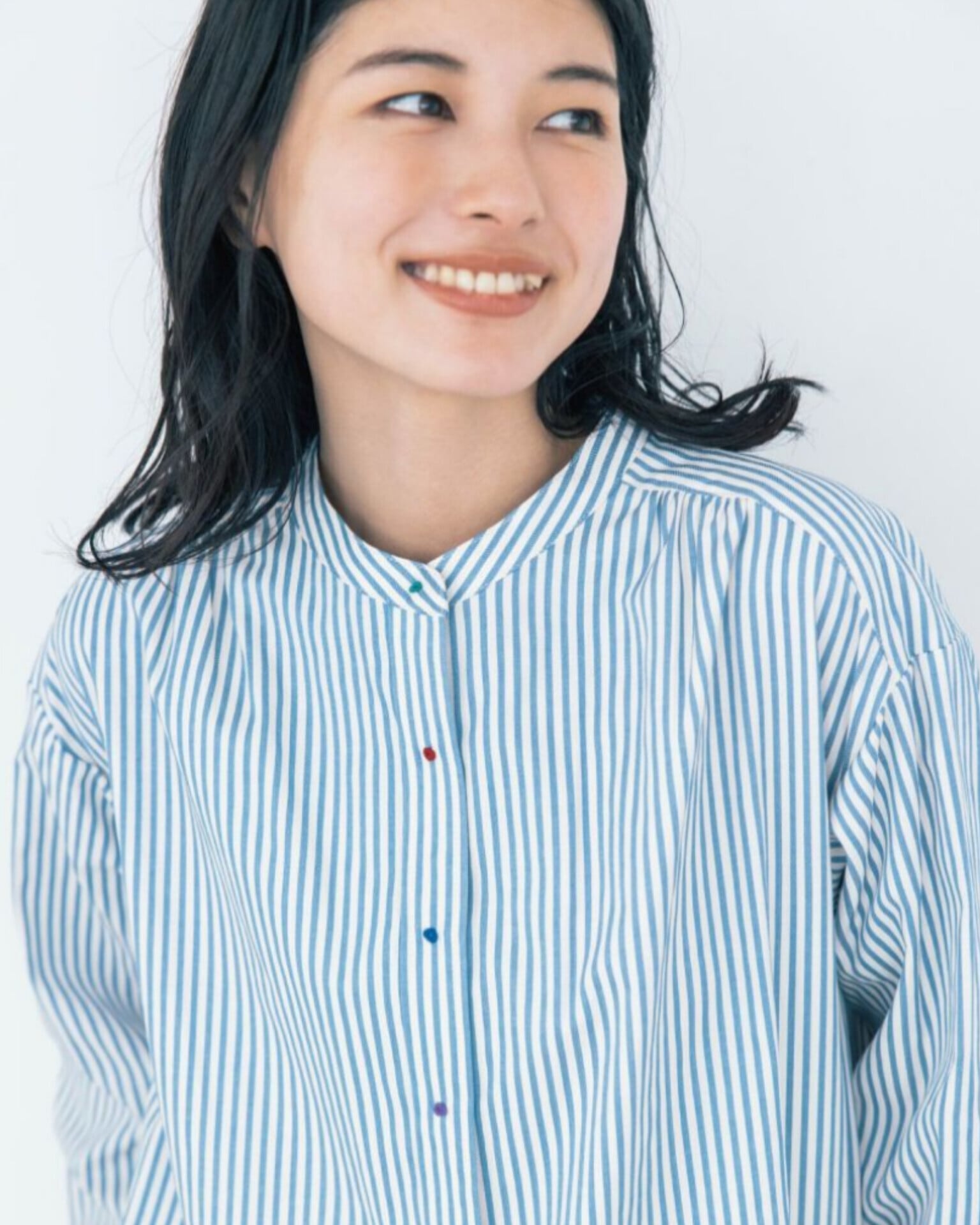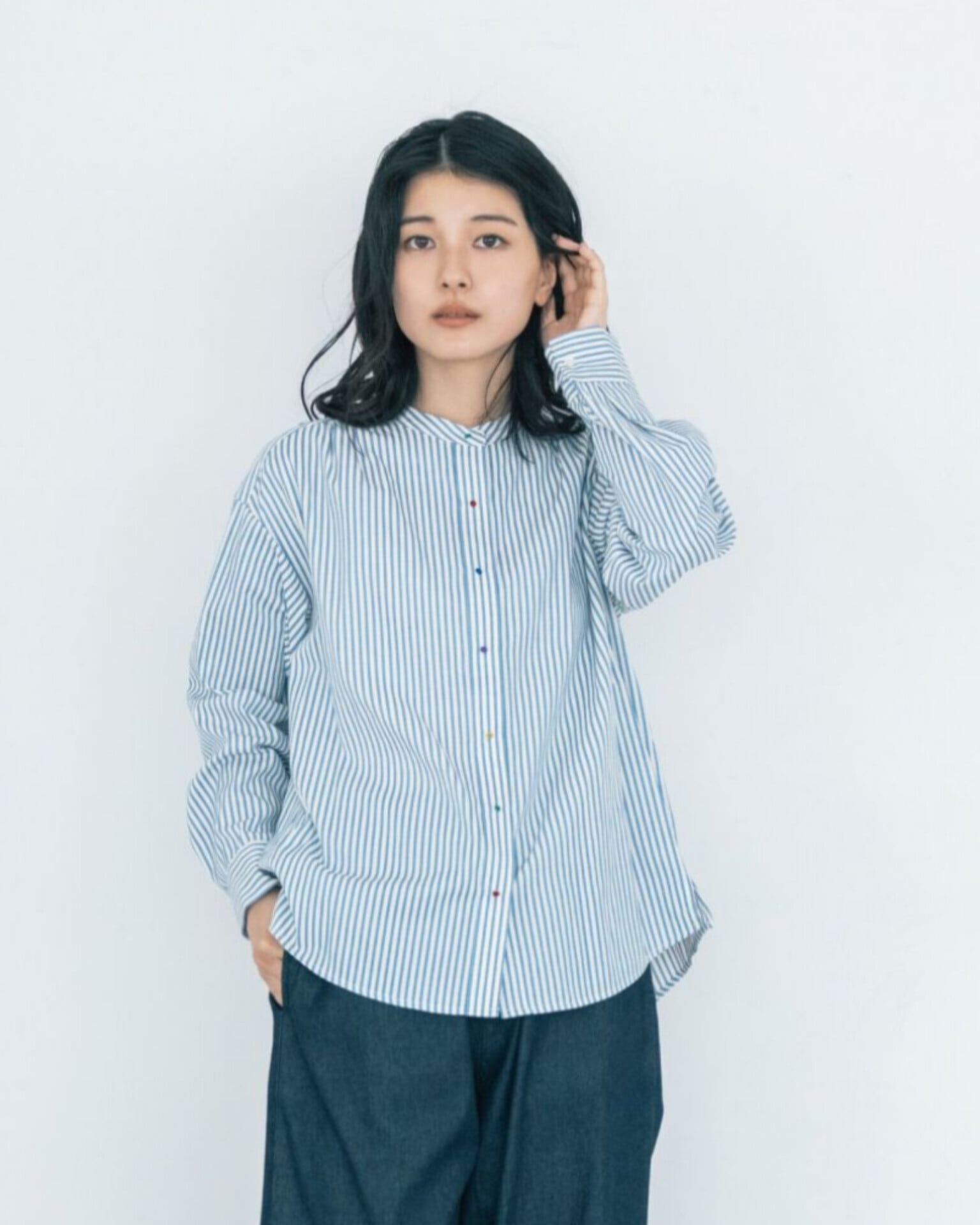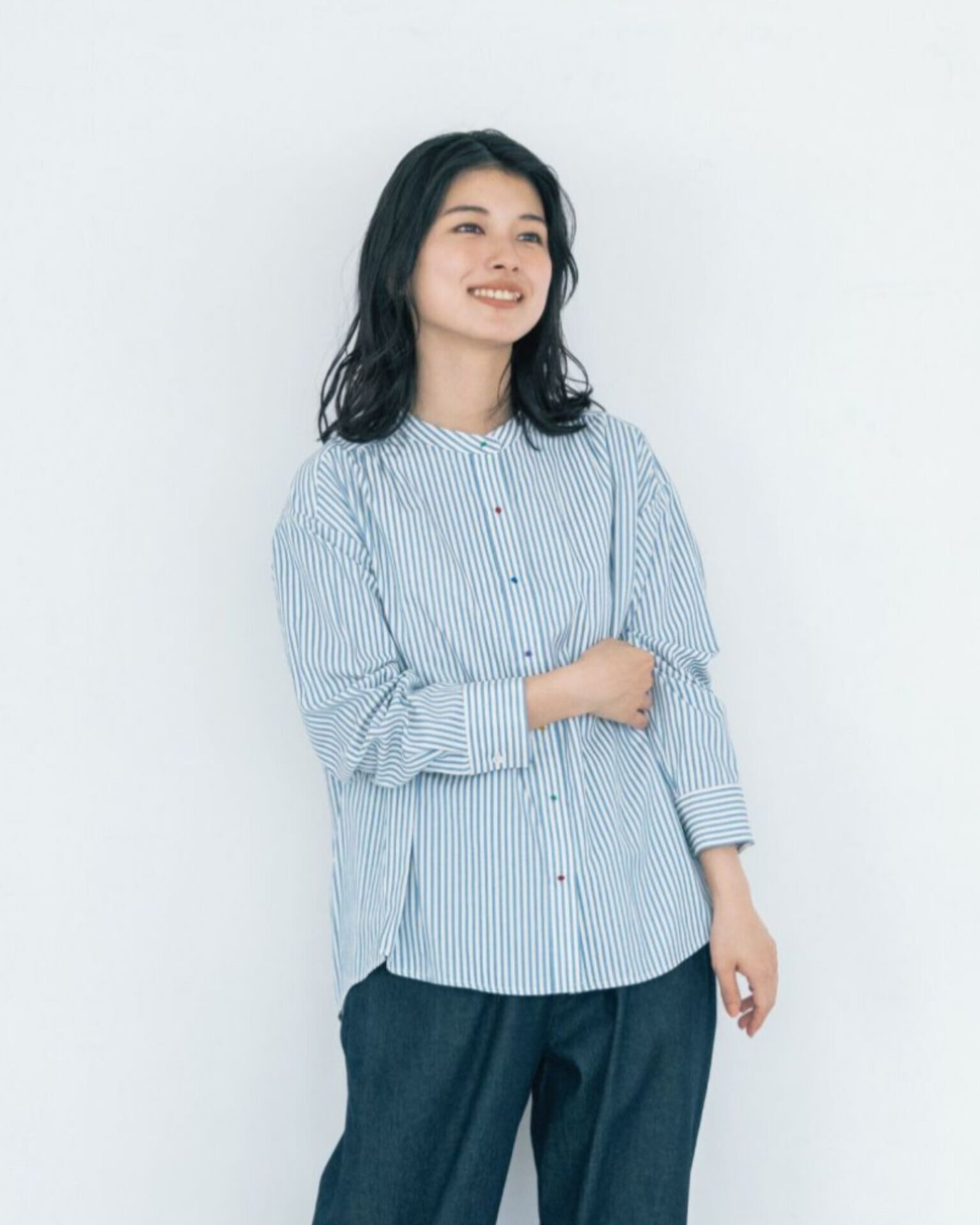 織に特徴のあるきれいめな生地を選び、カラフルボタンも大人っぽくシックに仕上げ、程よい遊び心と上品さを両立