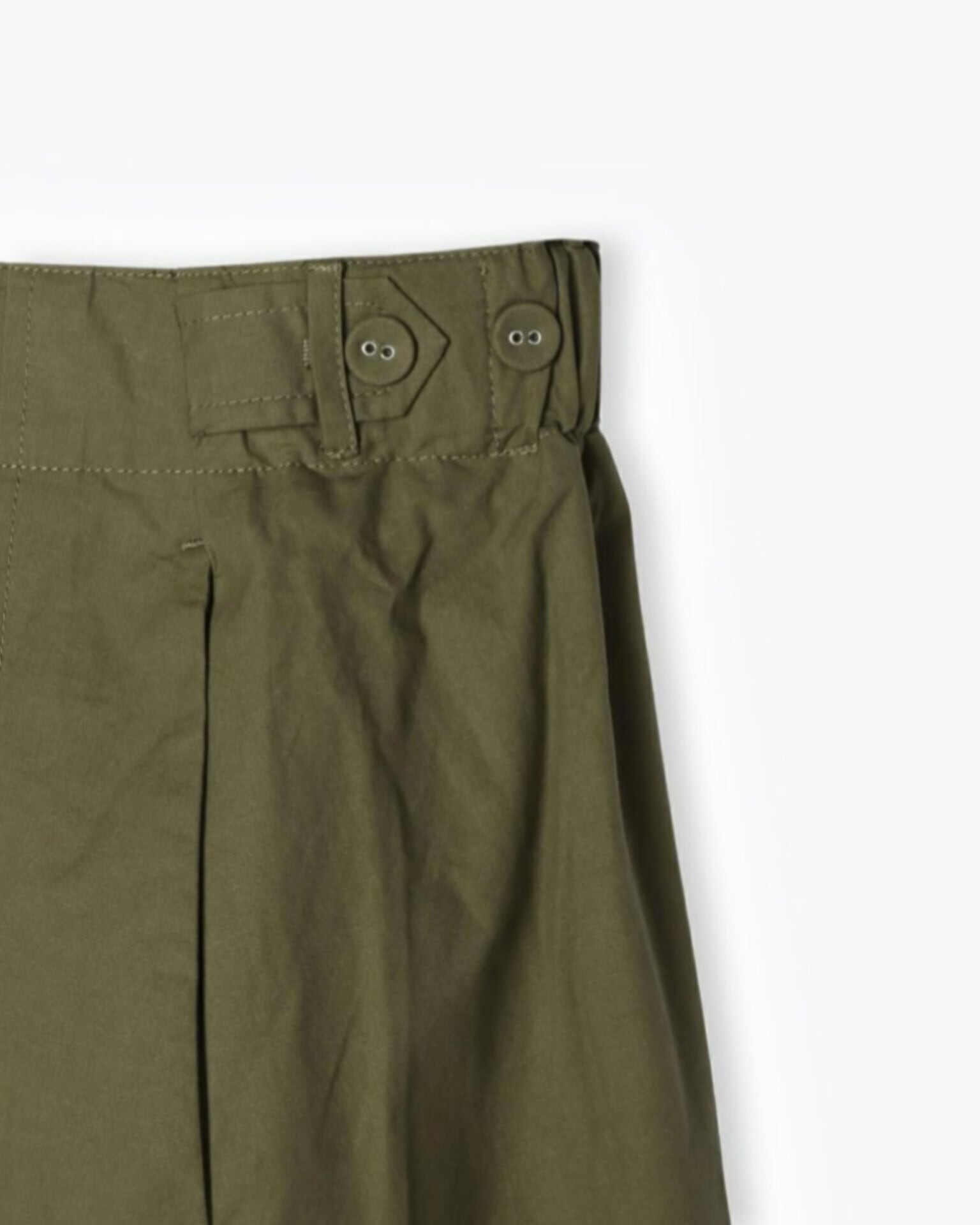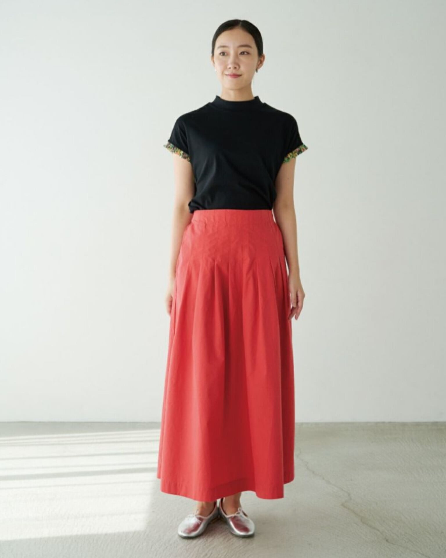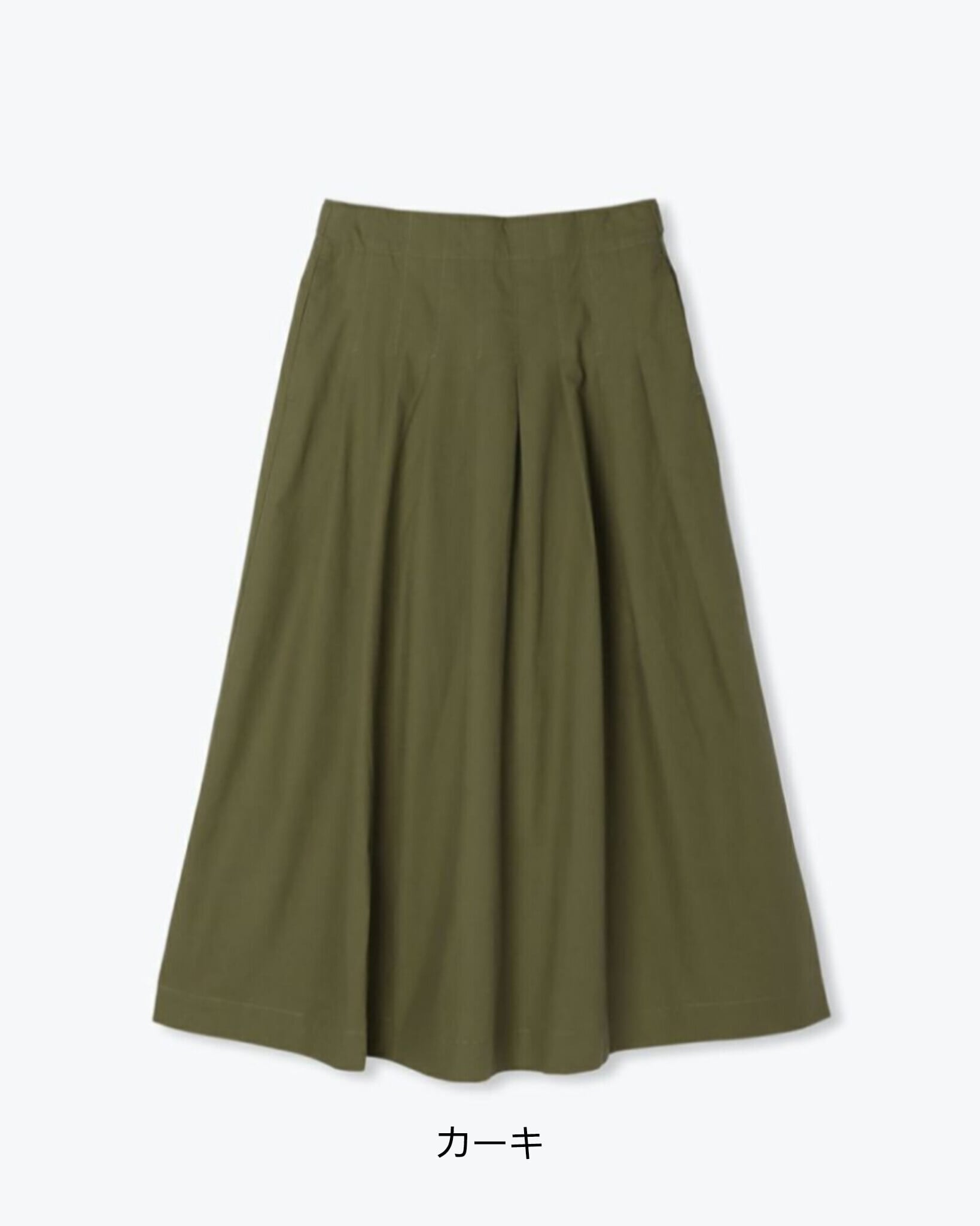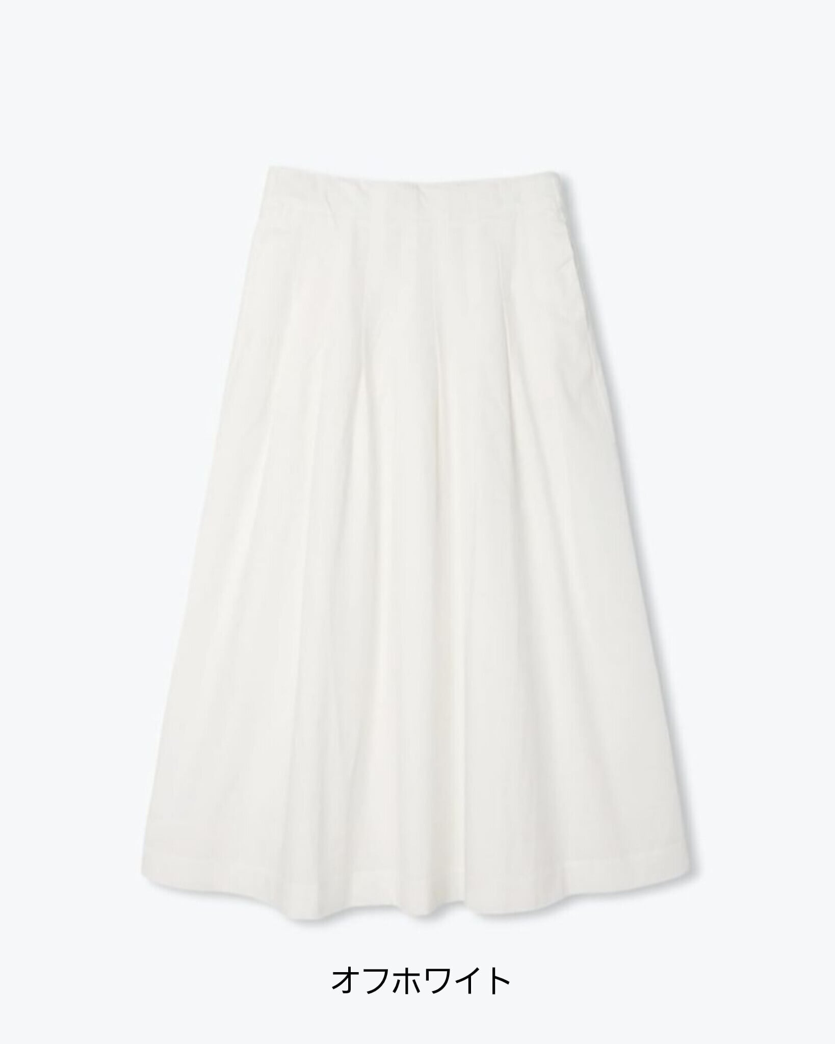 フロントのタックプリーツでウエスト周りのボリュームが抑えられるので、腰張りが気になる方もすっきりときれいに着ていただけます