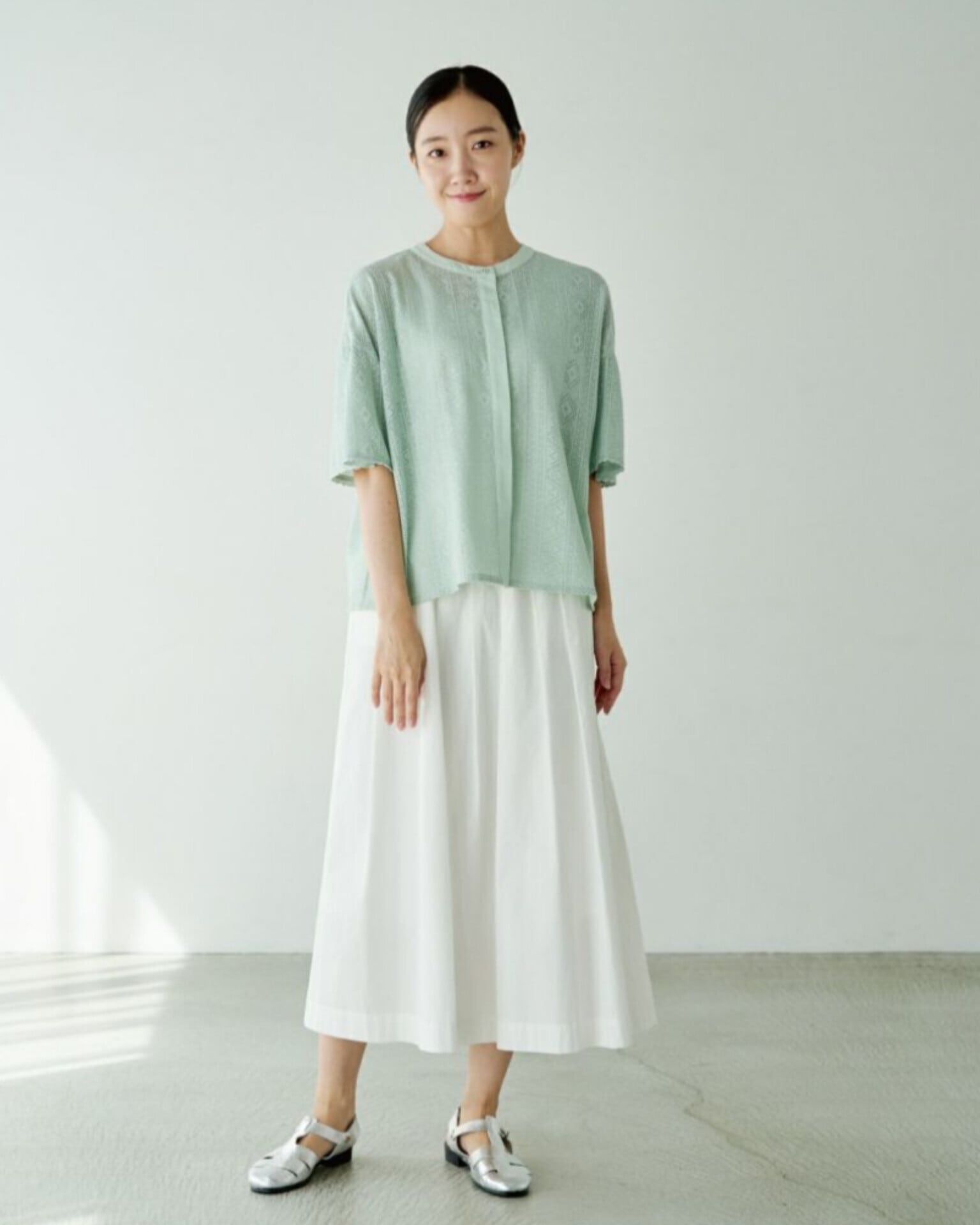 肌寒い時期にはニットと、夏はカットソーとのコーデがおすすめ