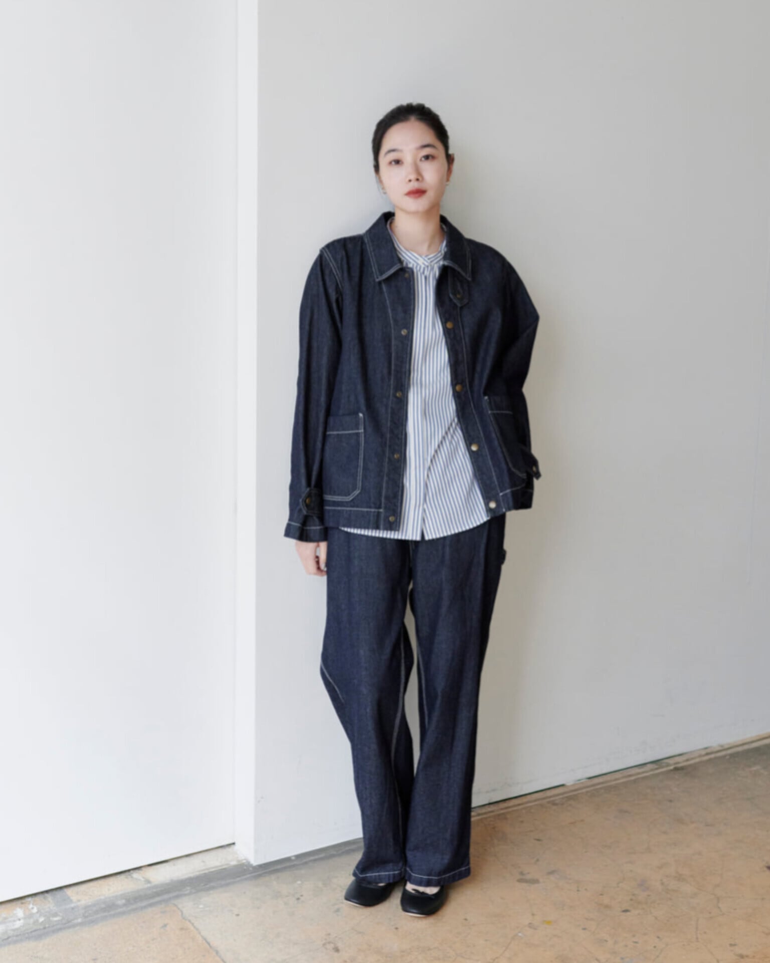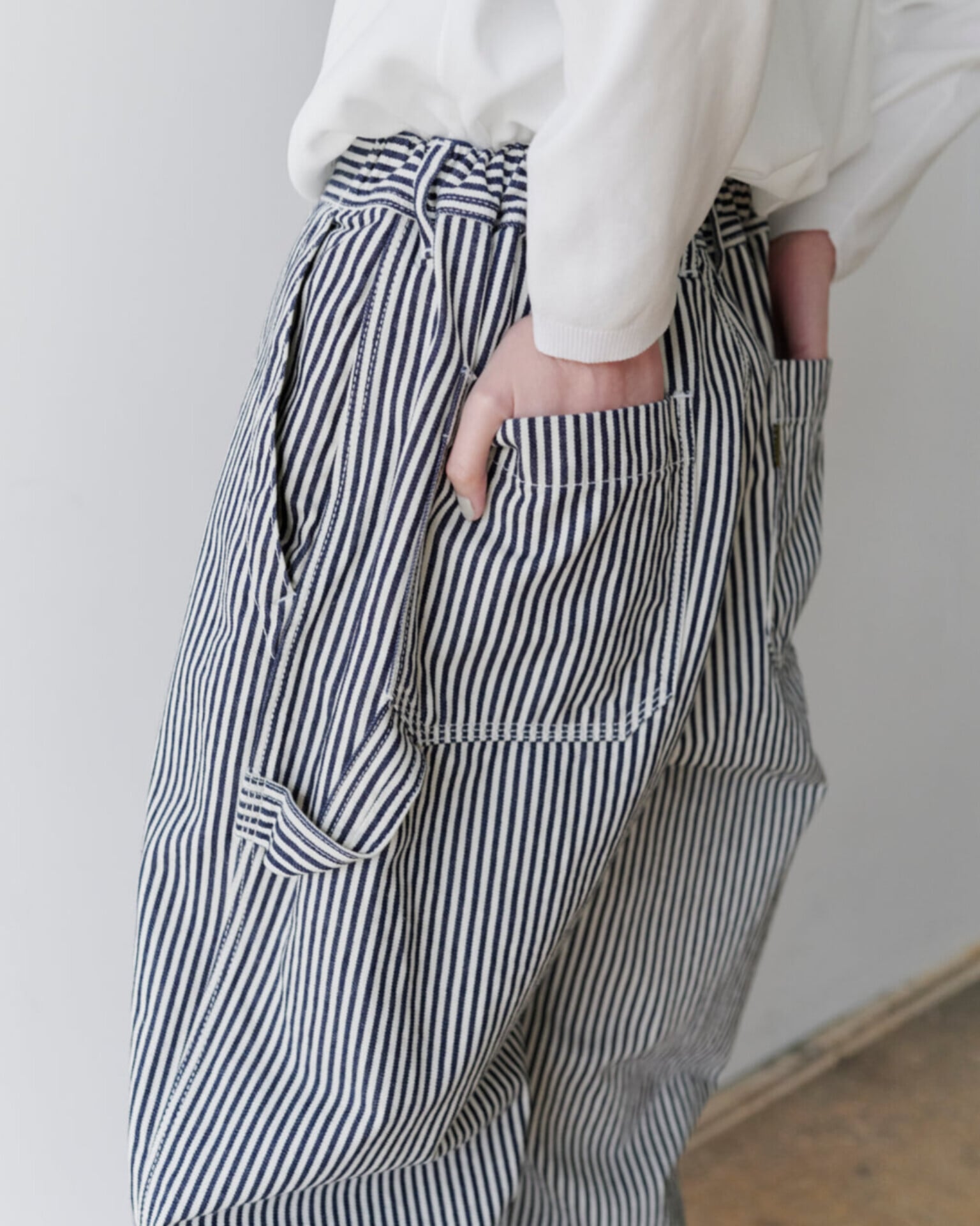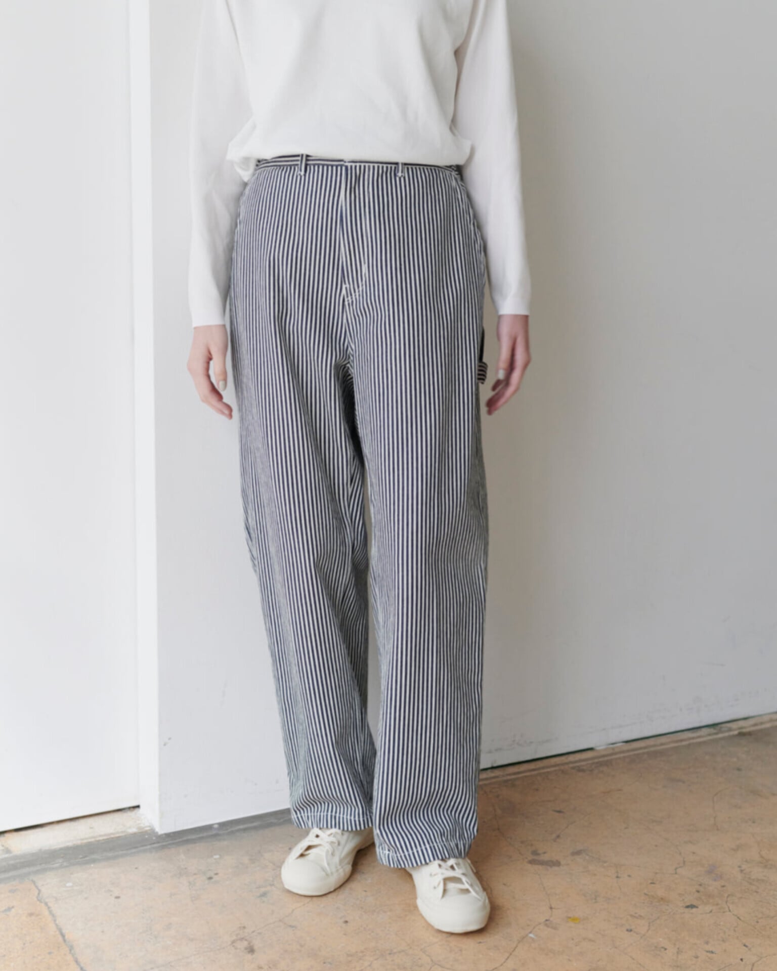 トレンドのヒッコリーストライプと、デニムを使用したペインターパンツ